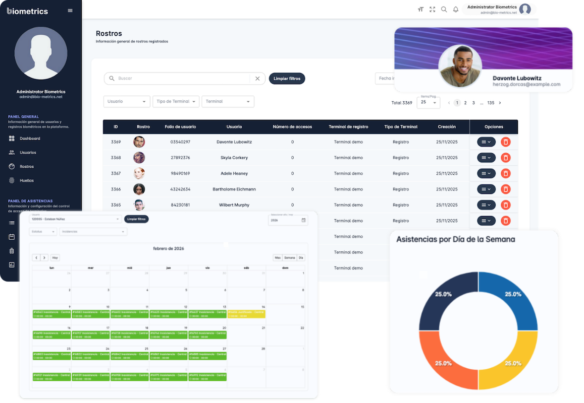 Biometrics es un ecosistema de plataformas digitales en la nube que se conectan entre sí para centralizar la operación de identidades, accesos y asistencias, garantizando eficiencia, seguridad y control total en toda la organización.
